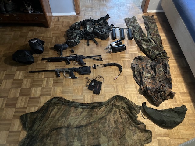 2 x Tippmann 98 mit Gasflaschen, Nachfüllbehäter, Weste mit vielen Taschen, Tarnnetz, Hose und Jacke etc.