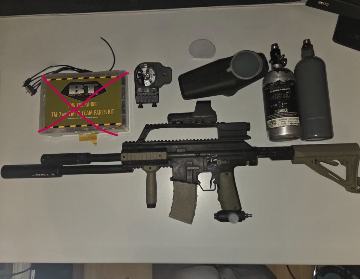 Ich verkaufe mein gesamtes Paintball Hobby Set, da meine Gruppe leider nicht mehr regelmäßig spielt. Die Ausrüstung ist gepflegt, aufgerüstet und sofort einsatzbereit.