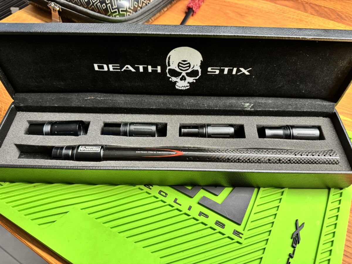 Ich verkaufe hier ein seltenes 14“ Carbon Laufset mit 4 Hülsen 0,686 + 0,689 + 0,692 + 0,695 der Marke Death Stix inkl. Versand. Das Set kommt im Koffer. Der Kauf ist noch in einwandfreiem Zustand. Passt an alle Cocker Gewinde (Planet Eclipse bzw. Dye