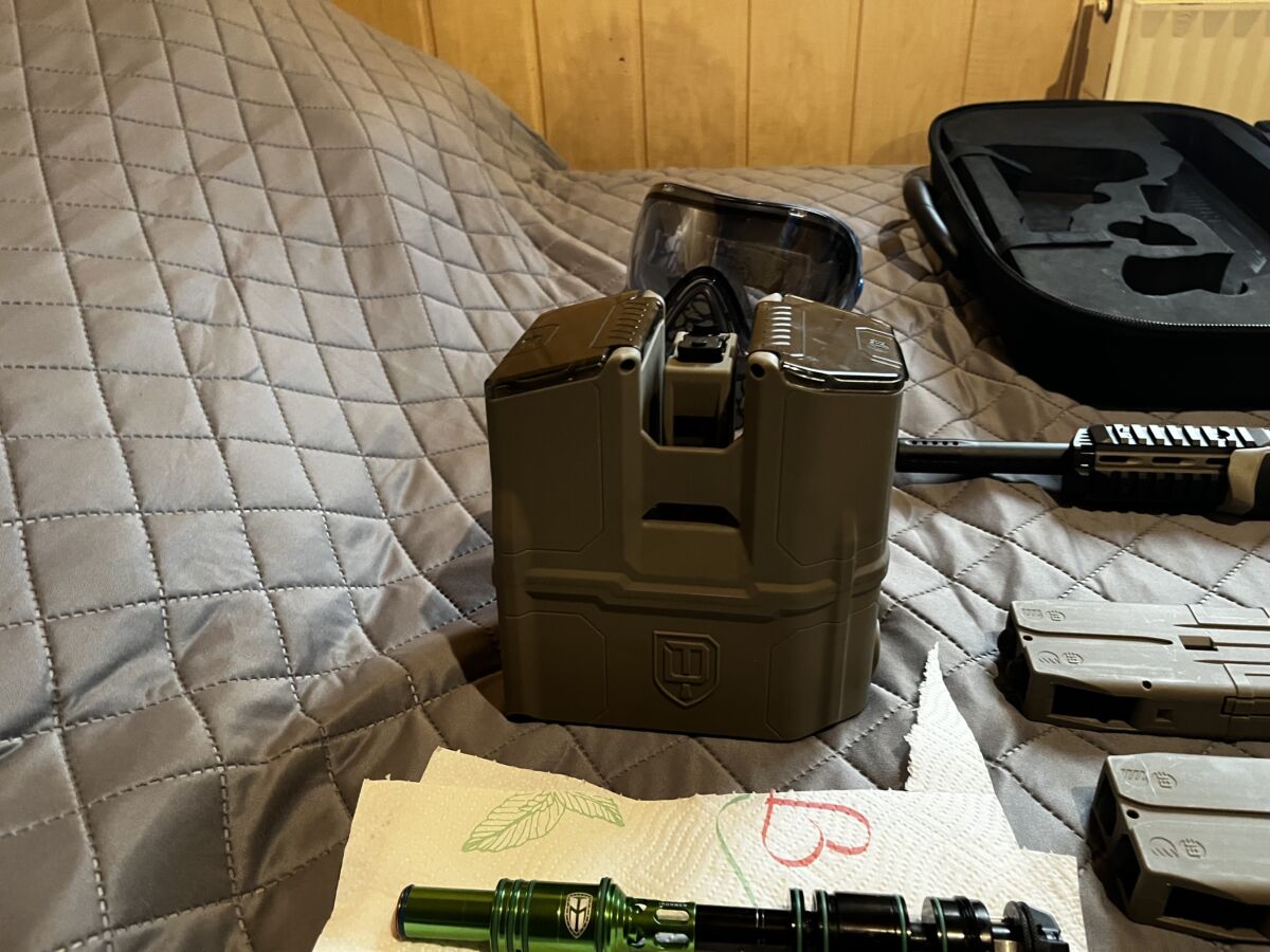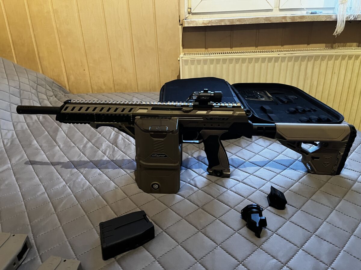 -DYE DAM Makierer ( erde ) mit original Tasche, Griff, Lauf, Schulterstüzte und 2 kleinen Magazinen