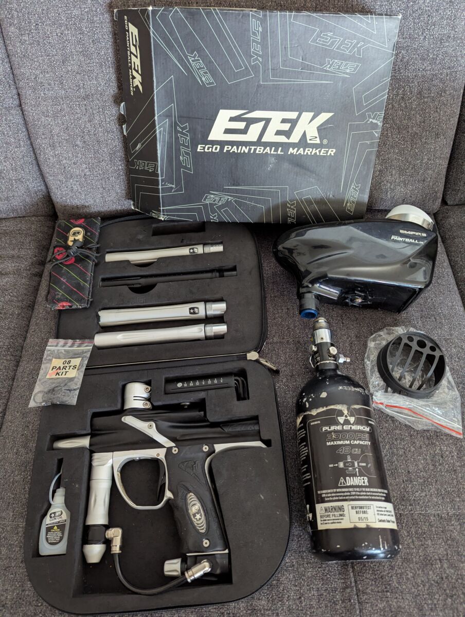 ich verkaufe einen gebrauchten Ego Etek 2 Markierer inklusive Pure Energy Druckluftflasche (TÜV bis 05/2015) und Empire Magna Drive Hopper. Alle Teile sind ihrem Alter entsprechend funktionstüchtig. Die Griffstücke vom Markierer fühlen sich nicht mehr so schön an, die Flasche braucht TÜV und beim Imbusset fehlen zwei Schlüssel. Alles in allem aber ein solides, preiswertes Set für Einsteiger. Der Preis beträgt 99 Euro Verhandlungsbasis.
