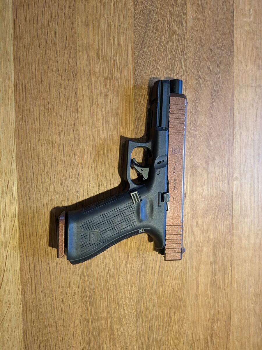 Der Schlitten und die Abschlüsse der Magazine wurden professionell von einem Unternehmen lackiert. Keinerlei Gebrauchsspuren am Lack. Die Glock ist eingeschossen und funktioniert tadellos.