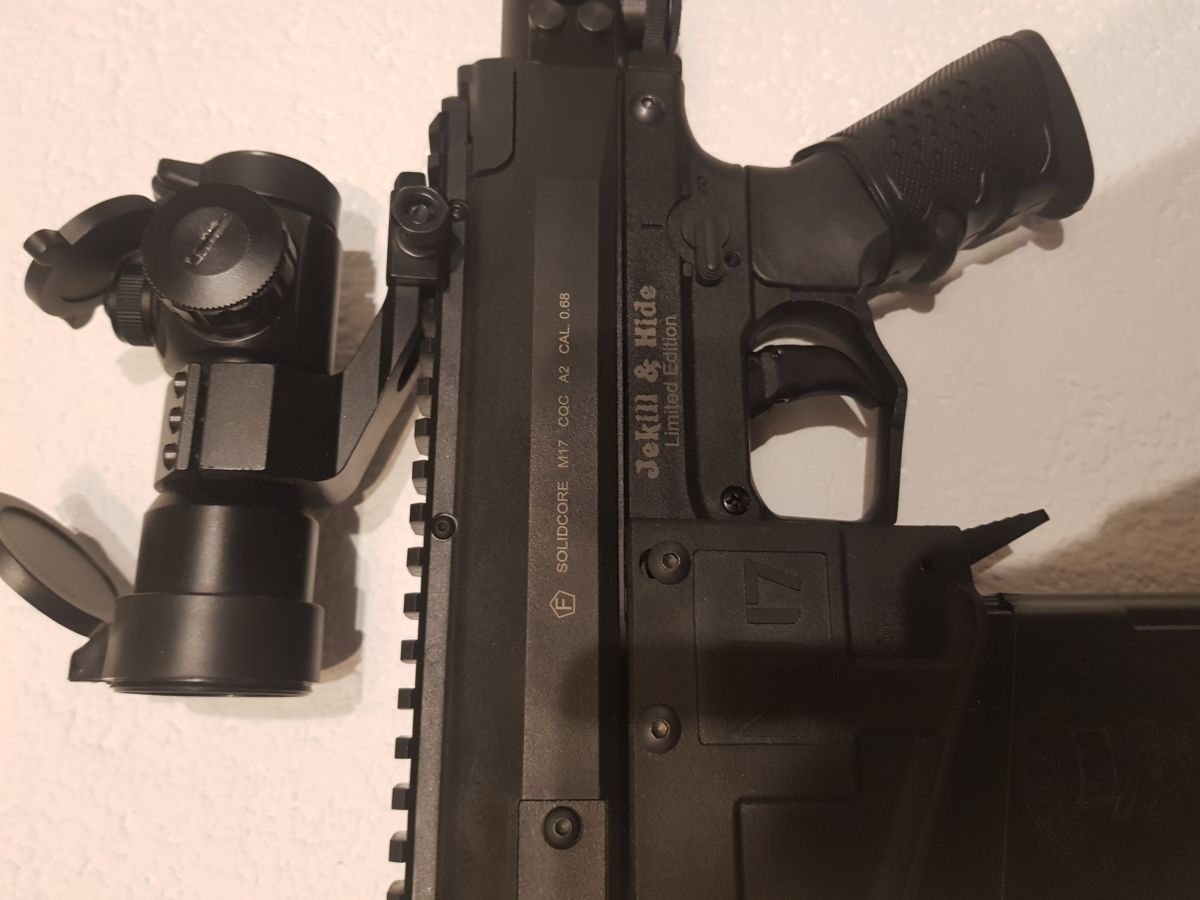 Besonderheiten: Absoluter Spitzenumbau der High End Customschmiede SOLIDCORE CUSTOMWORKS “out of the Box” Limited EditionArtikelbeschreibung:Auf Basis einer der zuverlässigsten und besten Magfed Milsim Markierer auf dem Markt, der Milsig / Valken M17, ist diese limitierte Edition entstanden. Es wurde alles verbaut, was diese Waffe noch effizienter, robuster und zuverlässiger macht. Alle Anbauteile sind extra für diese HARDCORE Kleinserie in Deutschland entwickelt und gefertigt worden. Die Basis Waffen werden unter Hunderten nach besonderen Qualitäts-Merkmalen ausgewählt wie z.bsp. Verabeitungstoleranzen, Präzision und Leistung. Ziel des Umbaus war es, diese eh schon geniale Waffe so umzubauen, dass sie “out of the Box” sofort unter extremsten Bedingungen in den Bereichen Law Enforcement sowie Magfed und Homedefense einzusetzen ist. Dieses “ready to fire Set” ist perfekt ausbalanciert und ergonomisch optimiert und bietet so ein traumhaftes Handling. Einige Besonderheiten sind z.Bsp. der M17 Barrel Block Adapter, der überarbeitete Lauf mit Frontgewinde, das “Vollmetall Combat 7 Zoll RIS System” sowie der “Dual use Jekill & Hide Vollmetall Flash Hider” mit Glasbreaker Tip. Das Magazin ist ein Dual Hybrid Magazin welches in der Lage ist, entweder 20 Schuss Round Balls also Gummi, Plastik, OC (Pfeffer) oder Marking (Farbe) und Powderballs aufzunehmen sowie 18 Schuss sogenannte Shaped Projectiles wie z.Bsp. Ballistic Target Rounds aus Hardplastic (Monolytgeschosse) oder die allseits bekannten First Strikes usw. Die Waffe verfügt über eine tolle Ergonomie und ein perfekt ausbalanciertes Gewicht, welches ein Top handling und extrem schnellen Magazinwechsel ermöglicht. Des Weiteren wurde sie mit diversen Lasergravuren versehen was das optische Gesamtbild der Waffe optimal abrundet. Geliefert wird diese tolle Waffe in einer individualisierten Jekill & Hide Limited Edition Box.