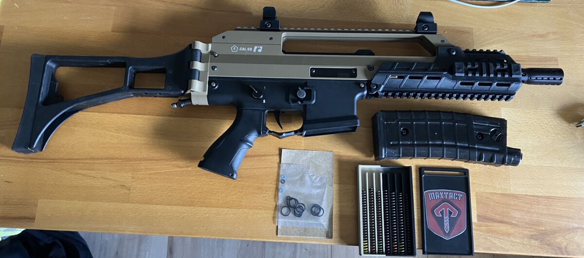 Zum Verkauf steht eine Maxtact TGR2 G36, eine der letzten die in braun zu bekommen waren, der Markierer ist ca. zwei Jahre alt. Der Tuninglauf ist von Tippmann und funktioniert erstaunlich gut mit dem Markierer, der Originallauf ist vorhanden und kann für 30 € dazu erworben werden.
