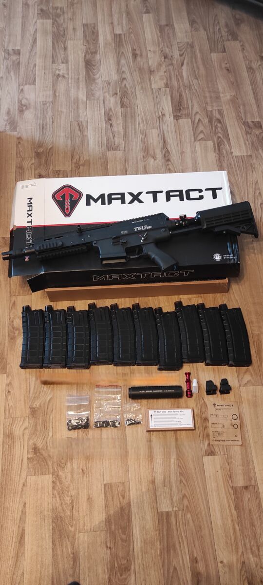 MAXTACT TGR one mit verbautem AREX Bolt (stabiler Luftfluß, weniger Verbrauch), gekauft am 19.05.2025 (Rechnung ist vorhanden). Ein sehr robuster Markierer, vollmechanisch, einfach zu warten (nur wenige Dichtungen, keine Gummi Balldetends) schwere Aussführung. Einfach geil! Markierer ist FSR von Werk ab.