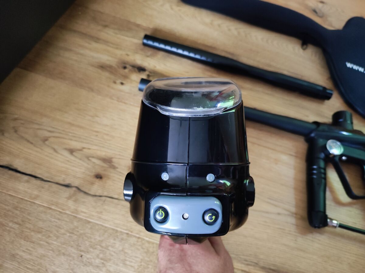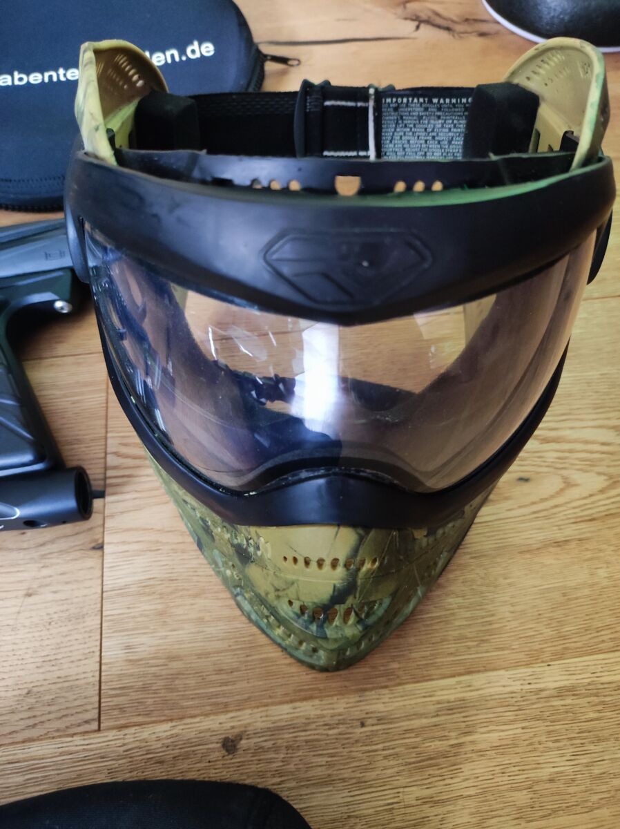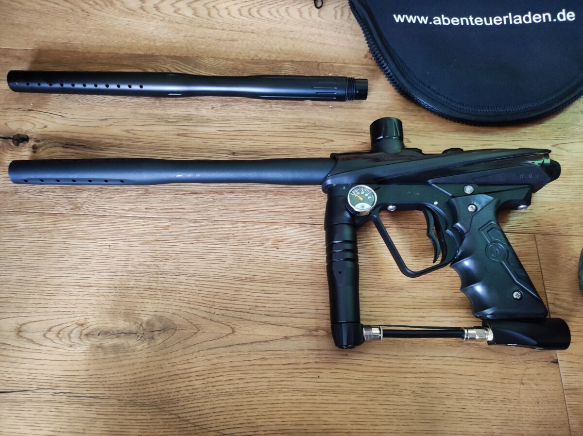 Mit Smart Parts Ion E-Pneumatischem Markierer, zusätzlichem Lauf, elektrischem Feeder, shark 300bar 0.79Liter Flasche, Hülle für die Flasche, Tasche für den Markierer, sowie Valken Maske.
