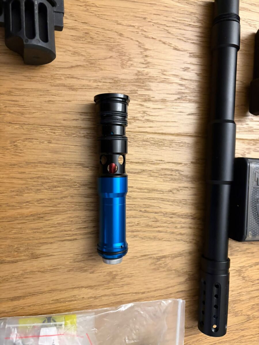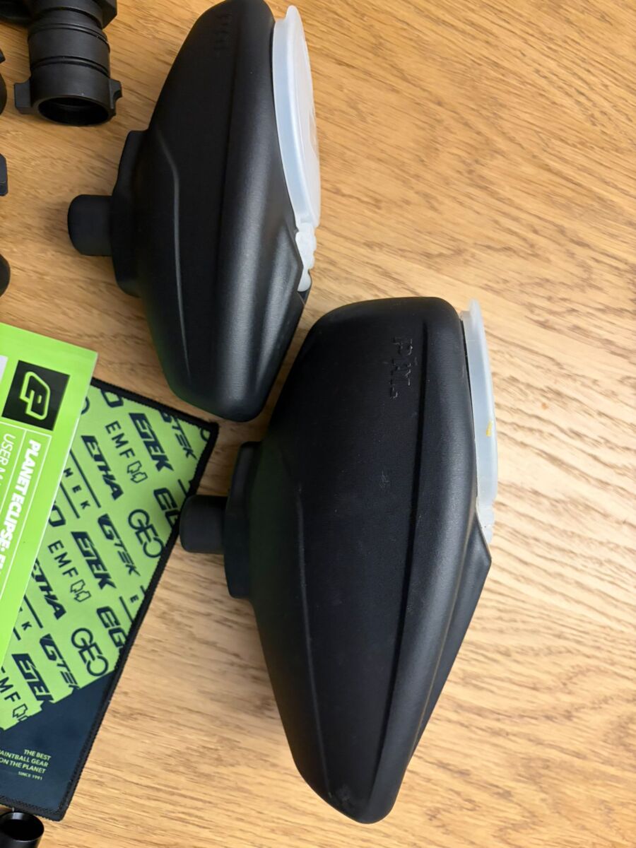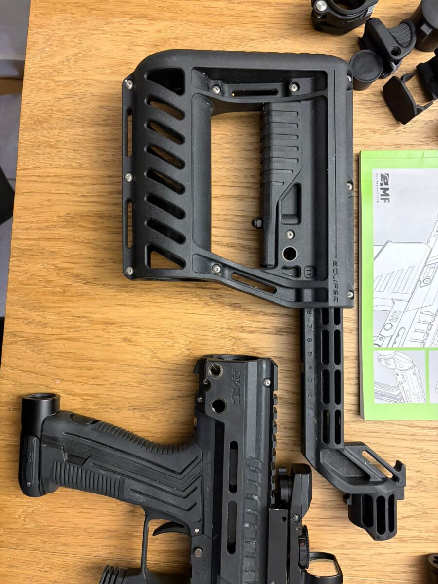 biete hier eine Planet Eclipse EMF 100 mit dem abgebildeten Zubehör ( 1x 200Bar Flasche, 1x 300 Bar Flasche / Kurzer Lauf etc. und diversen Anbauteilen. Orginale Planet Eclipse Ersatzteile sind auch dabei. Markierer läuft einwandfrei.