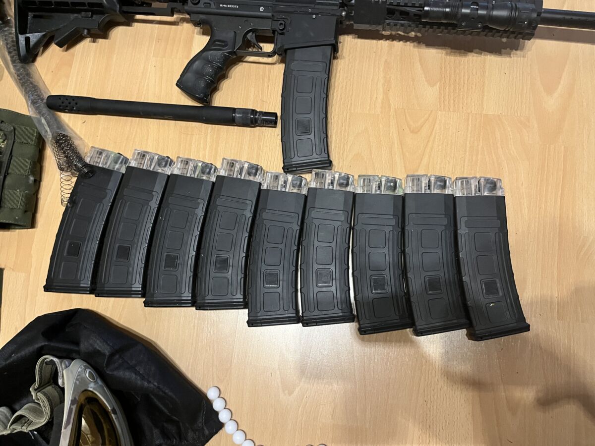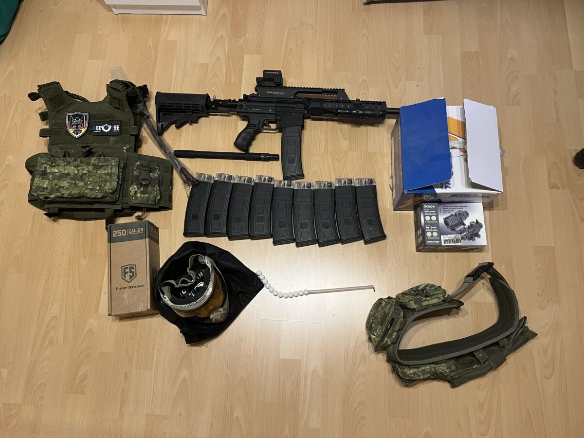 9 Magazine mit verstärkter Feder für First Strike Kugeln, Rotpunktvisier und Holographisches Visier, Weste mit Magazinhaltern für insgesamt 8 Magazine und Bauchgürtel für sonstigen Zubehör, ca. 1000 Schuss Kugeln, an dem Markier ist eine Taschenlampe befestigt mit Blitzlichtfunktion. Des Weiteren ist auch noch ein Gesicht Schutz dabei in sehr guten Zustand. Zusätzlich ist noch sehr viel weiterer Zubehör dabei, für sämtliche Visiere.