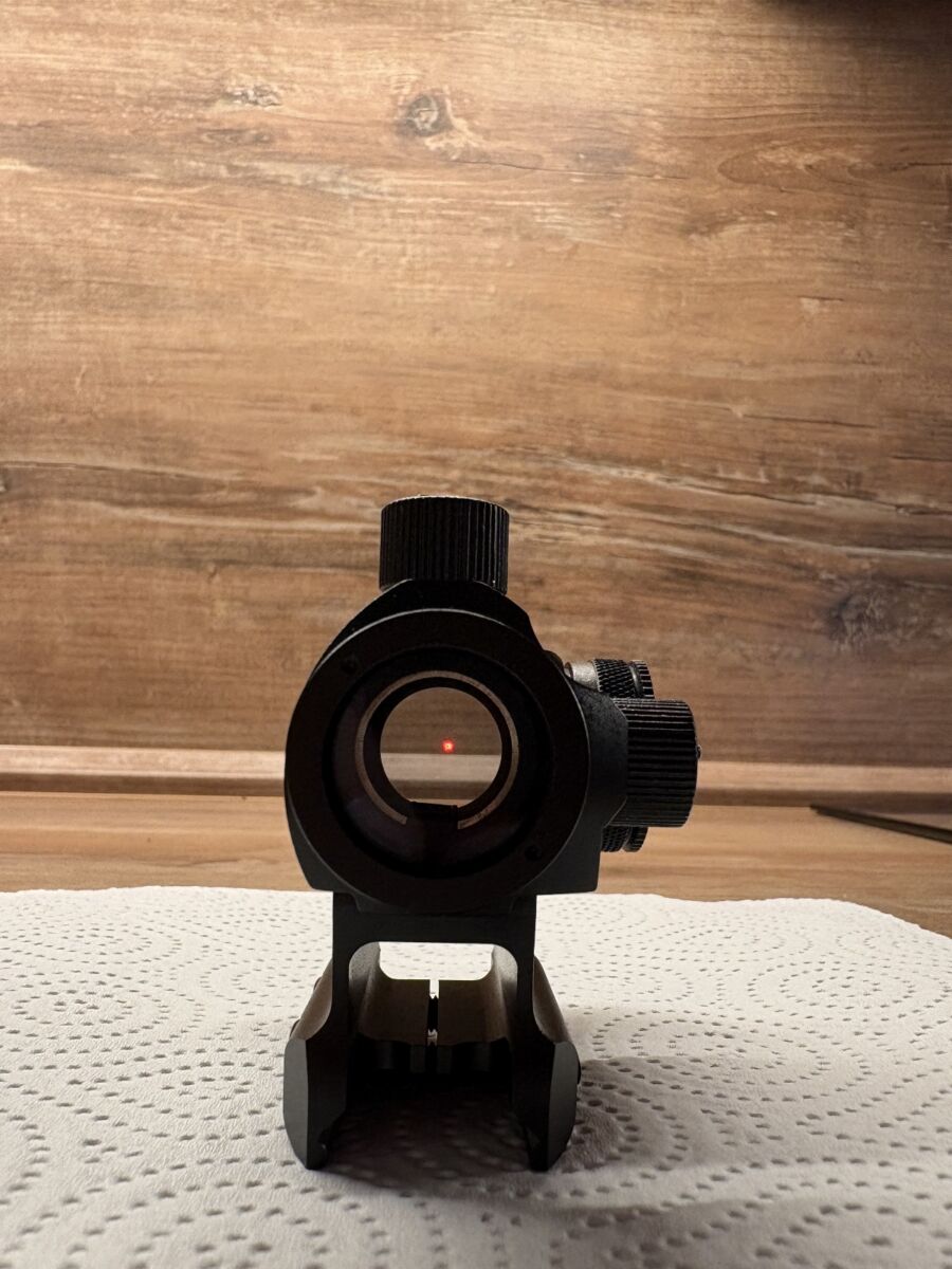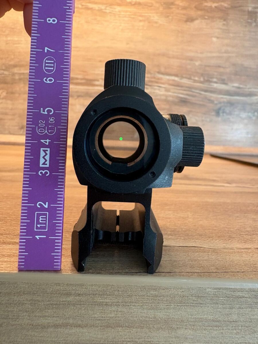 Dazu gebe ich noch eine 2. Halterung, mit der das DOT noch höher kommt, je nach Maske passt es dann sehr gut, man hat dort aber auch die Möglichkeit über „Kimme und Korn“ zu zielen bzw. direkt über den Lauf gucken können.