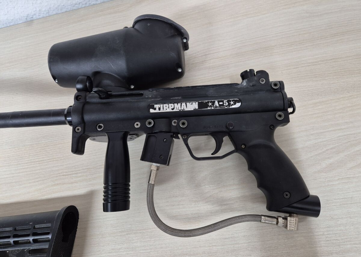 Verkauft wird eine Tippmann A5 der alten Generation (Sicherungspin statt Drehknopf wie bei der neuen Variante).