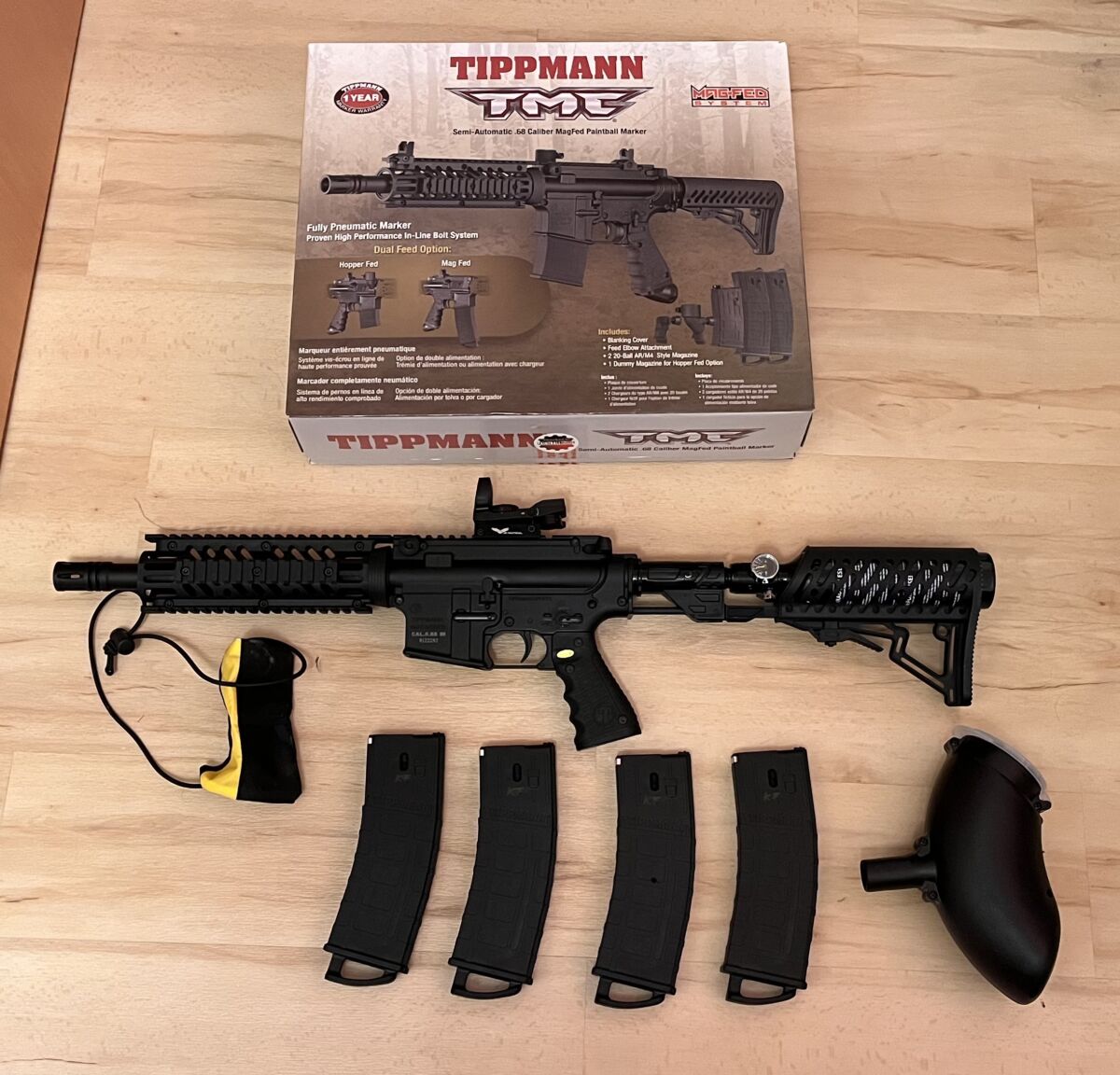 Hallo ich Verkaufe meine Zwei mal Benutze Tippmann TMC umgebaut zur Elite Variante. Es sind 4 Mags dabei der Hopper und das Werkzeug und ein RedDot Visier, 0,2L 200Bar Flasche ist dabei. Gekauft habe ich die Tippmann im September 2025 also so gut wie neu. Rechnung ist Vorhanden