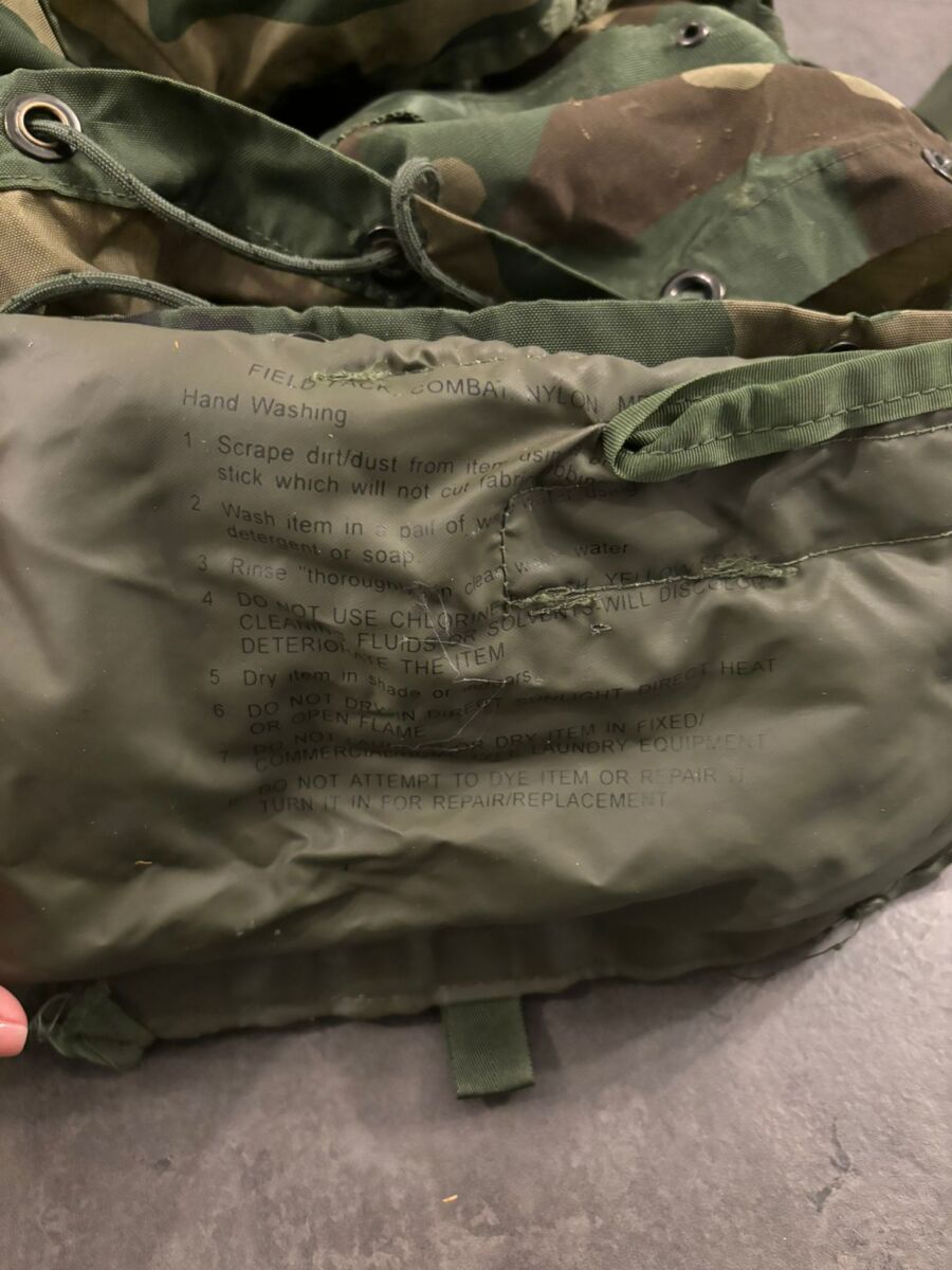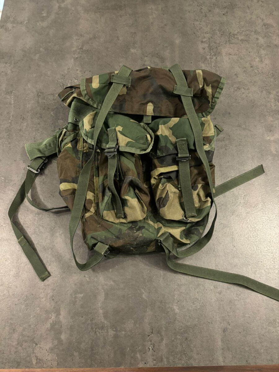 zum Verkauf steht ein im Waldtarn und mit vielen Taschen versehener Rucksack (vermutlich Fallschirmjäger).– für längere Einsätze. (Lieferumfang: ´1 x Tasche)